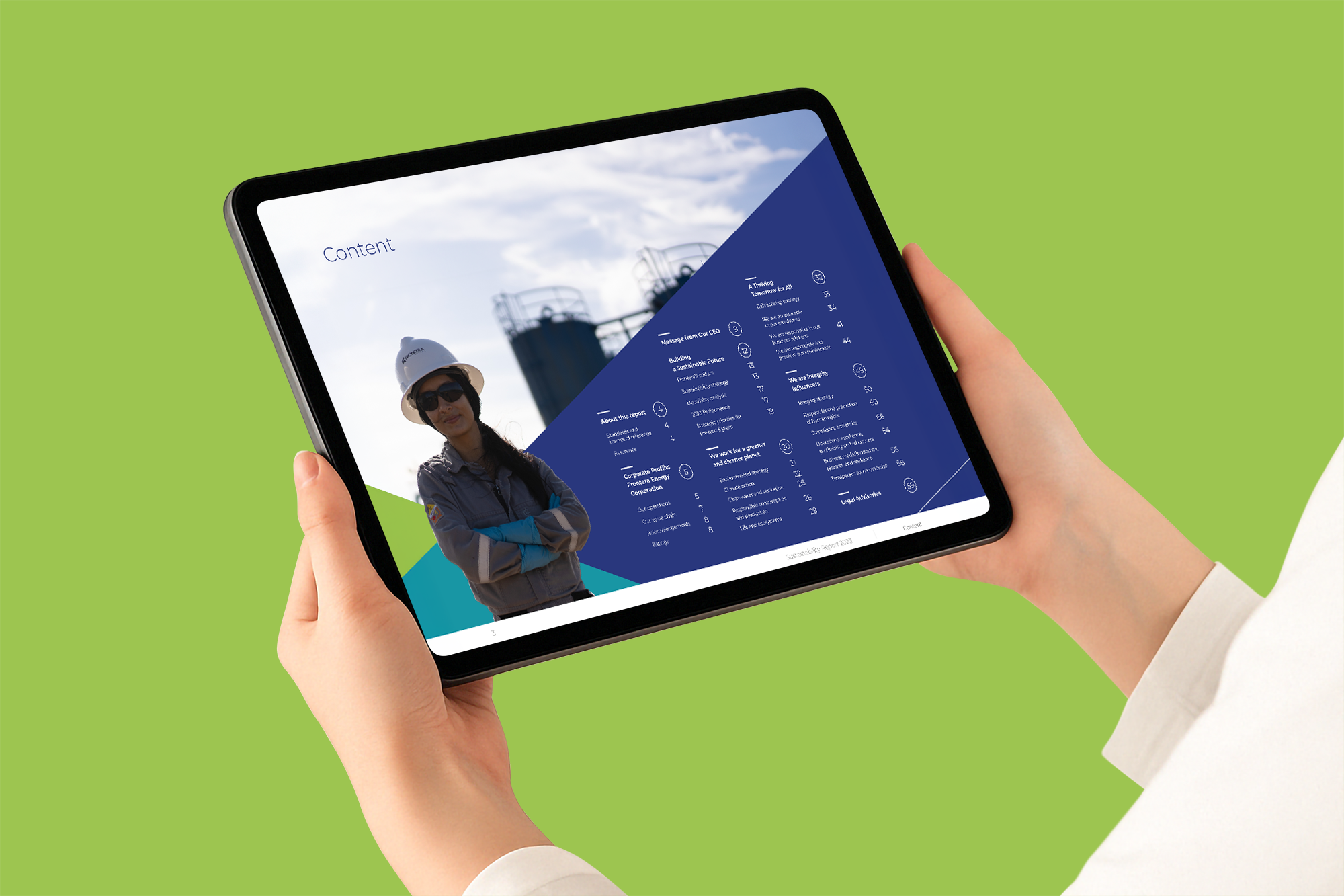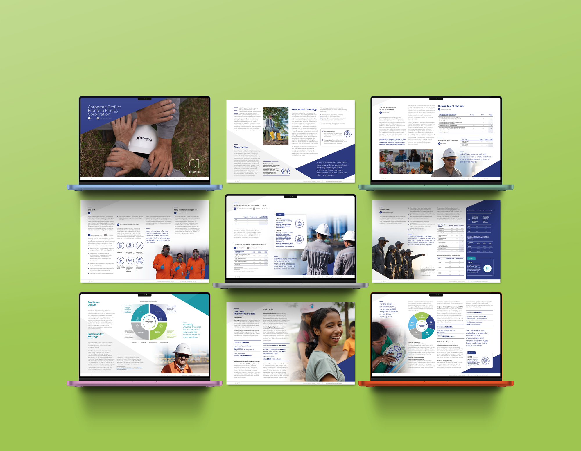 Frontera Energy necesitaba consolidar su gestión en un solo documento para comunicar sus resultados, compromisos y estrategia de sostenibilidad 2023. El desafío fue traducir la complejidad de datos ESG en una narrativa clara, visual y accesible , destacando el impacto positivo en el planeta y el bienestar de las comunidades.